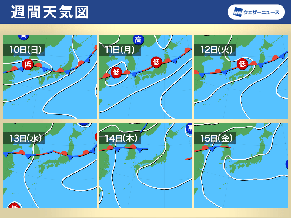 本州の南岸付近まで南下した前線は、週末以降再び北上し、本州付近に停滞する見込みです。このため、東北から九州にかけて広範囲で曇りや雨となり、梅雨が戻ったかのような天気が続きます。