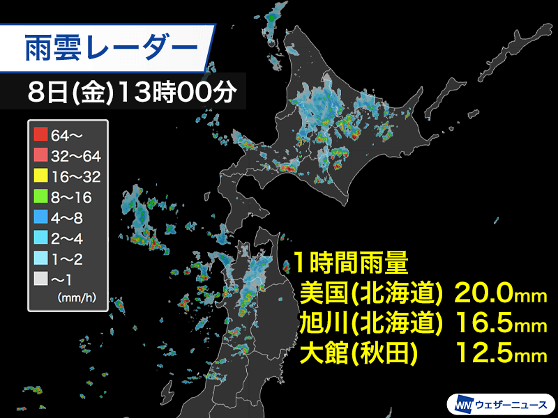 昨日から活発な雨雲が次々に通過し、現在は北海道の各地や青森県、秋田県で雨が強まっています。13時00分までの1時間には北海道積丹町・美国で20.0mmの強い雨、旭川市、秋田県大館市で12.5mmのやや強い雨を観測しました。総雨量が多くなっている青森県や秋田県には土砂災害警戒情報が発表されている地域があります。
