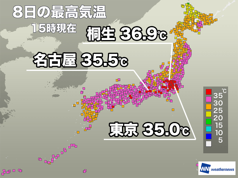 15時までの最高気温が最も高くなったのは群馬県桐生市で36.9℃まで上昇。そのほか、埼玉県熊谷市で36.4℃、千葉県船橋市で36.3℃など体温並みの暑さです。また、東京都心で35.0℃、名古屋市は35.5℃まで上がって、43地点で猛暑日になっています。