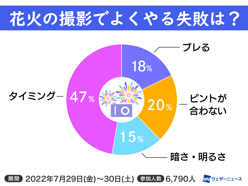 「花火大会の会場で場所を決めるときは、そこが風上か風下か、風向きを調べておきましょう。派手な花火で締めくくりとなるプログラムがほとんどなので、最後のほうで華やかな写真を撮ろうとしがちですが、風下にいる場合は、後半になればなるほど煙が立ち込めて花火がきれいに写らなかったというケースも少なくありません。一般的には、南風が多い夏は北側を避けて、風上の南側にいた方が良いでしょう。