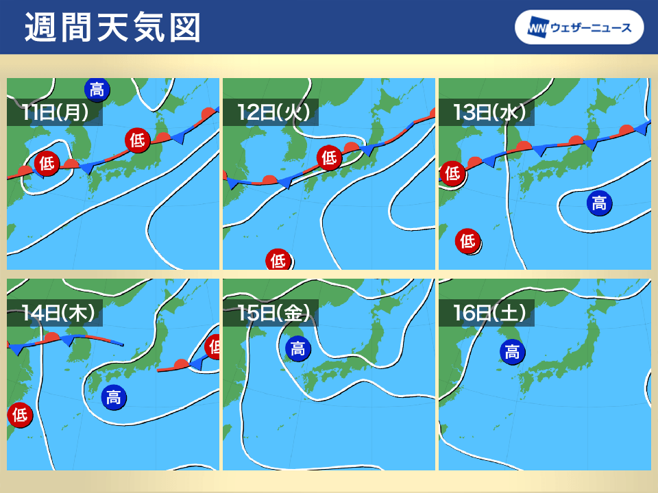 来週中頃にかけて本州付近に停滞する前線の影響で雨が続きます。この前線上の低気圧が日本海沿岸を東進する見込みです。