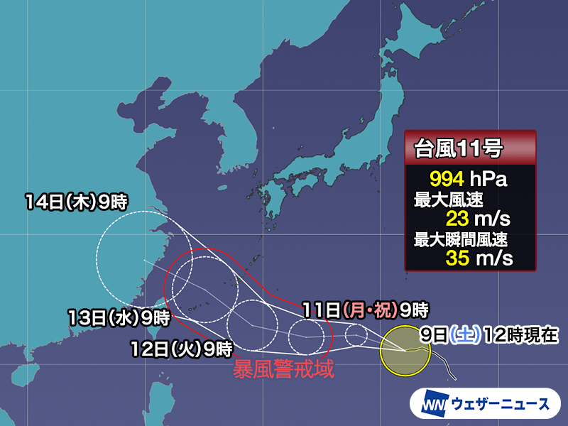 11日(月・祝)山の日は前線の活動が活発になり、特に九州の東シナ海側で強雨や雷雨となるおそれがあります。大雨による低地の浸水や土砂災害などに警戒してください。