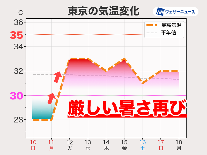 ただ、13日(水)以降は再び高気圧が張り出して前線が北上するため、西日本や東日本では35℃近くまで気温が上がる日が多くなります。引き続き万全の熱中症対策が欠かせません。