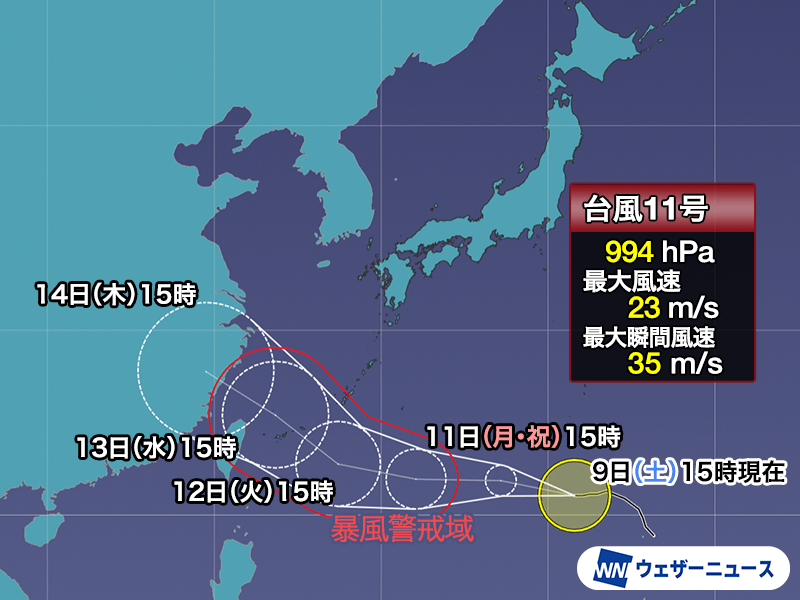 台風11号は発達しやすい条件の海域を進んでいて、今後暴風域をもつ勢力になる予想です。連休明けの12日(火)にかけて沖縄の南大東島の南を西進し、12日(火)から13日(水)頃にかけて沖縄本島〜先島諸島の付近を通過する見通しとなっています。
