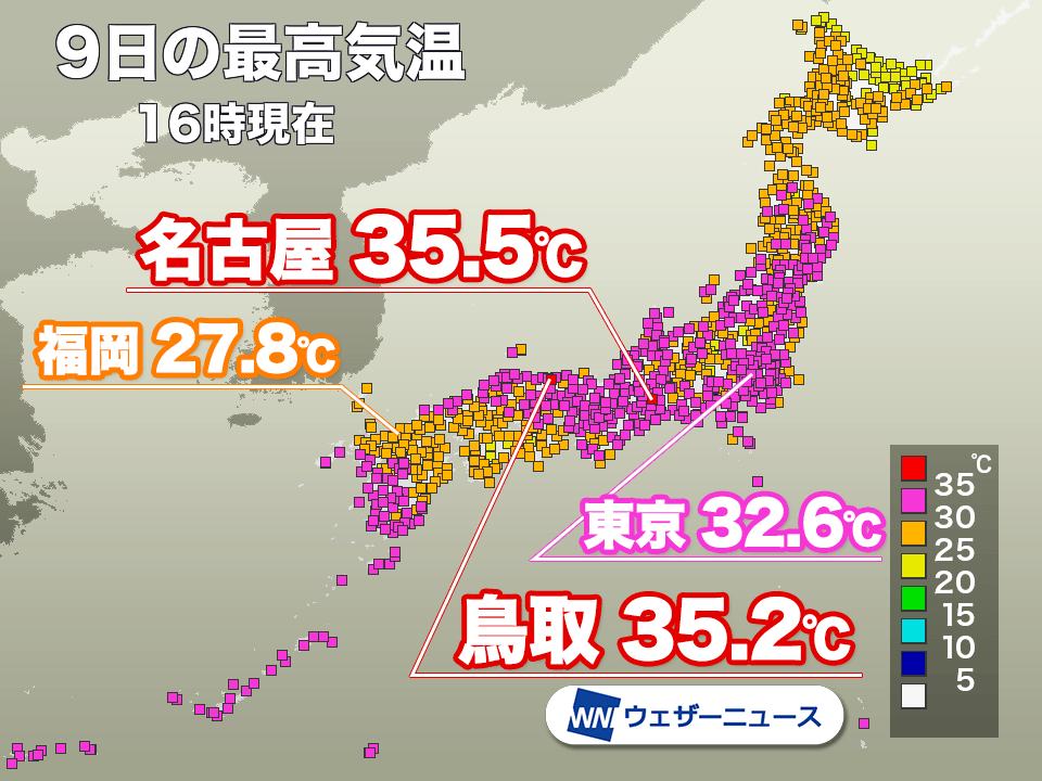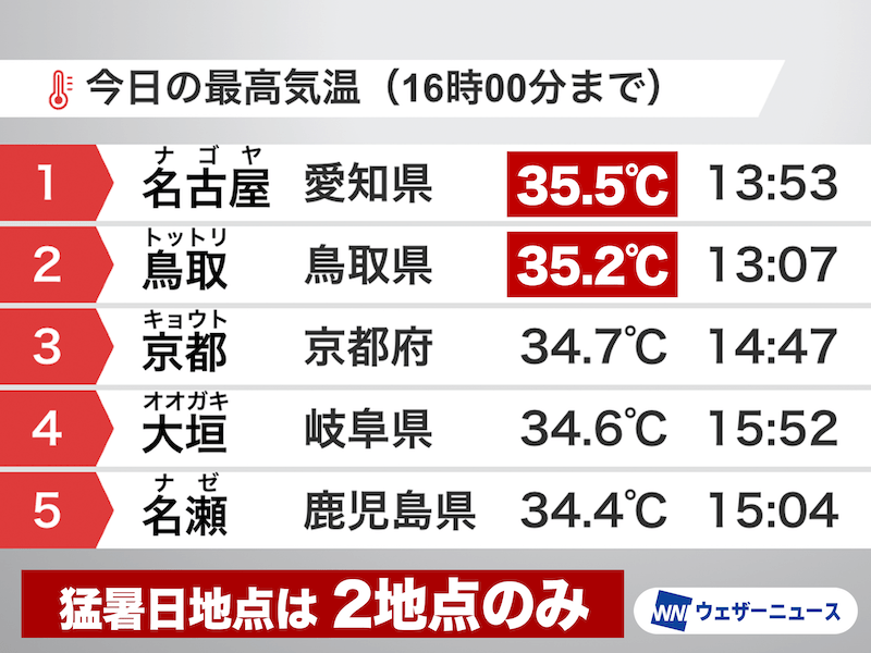 16時時点で35℃以上を観測した猛暑日地点は全国で名古屋(35.5℃)と鳥取(35.2℃)の2地点のみでした。