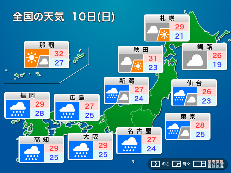 予想最高気温は札幌や大阪、福岡で29℃、東京で28℃、名古屋で27℃です。最高気温が30℃を下回れば東京で7月16日、名古屋や大阪で7月17日、福岡では7月18日以来となります。