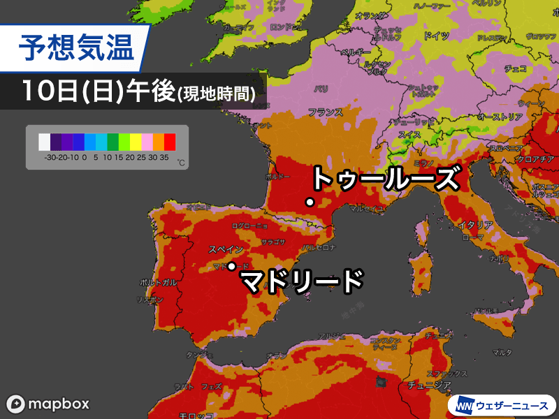 この熱波は少なくとも週前半は続く見通しで、一部の地域では40℃を超える見通しです。スペイン、フランスの気象当局は高温に関する警報を発表し、熱中症などに警戒するよう呼びかけています。