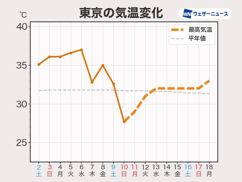 ただ、13日(水)以降は再び高気圧が張り出して前線が北上するため、西日本や東日本では35℃近くまで気温が上がる日が多くなります。引き続き万全の熱中症対策が欠かせません。