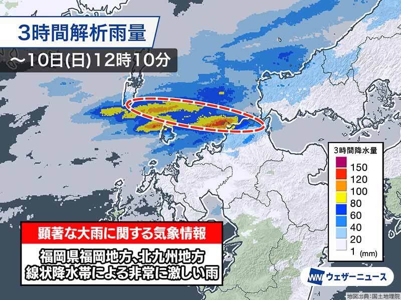 福岡管区気象台は、福岡地方・北九州地方で線状降水帯による非常に激しい雨が同じ場所で降り続いているとして、12時17分に「顕著な大雨に関する情報」を発表しました。