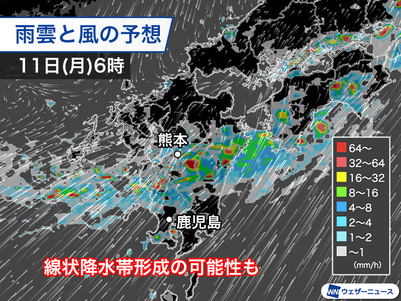 現在は雨が小康状態となっている鹿児島県内でも今夜から明日11日(月)朝にかけて再び雨の強まり、線状降水帯が形成された場合は非常に激しい雨が降るおそれがあります。