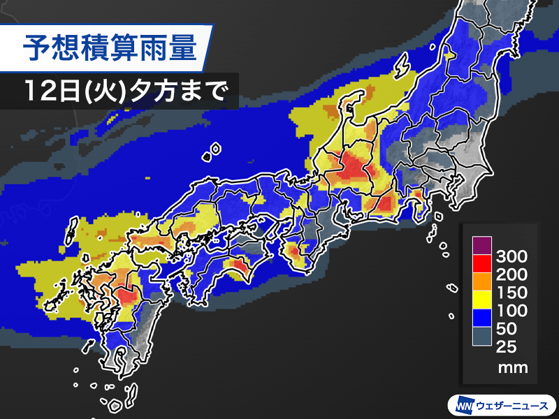 前線の活動は三連休明けとなる12日(火)にかけて活発な状態が続く予想となっています。12日(火)昼までの48時間雨量は九州や中国、四国、東海などで200mmを超える所があり、局地的には300mm近い大雨になる見込みです。