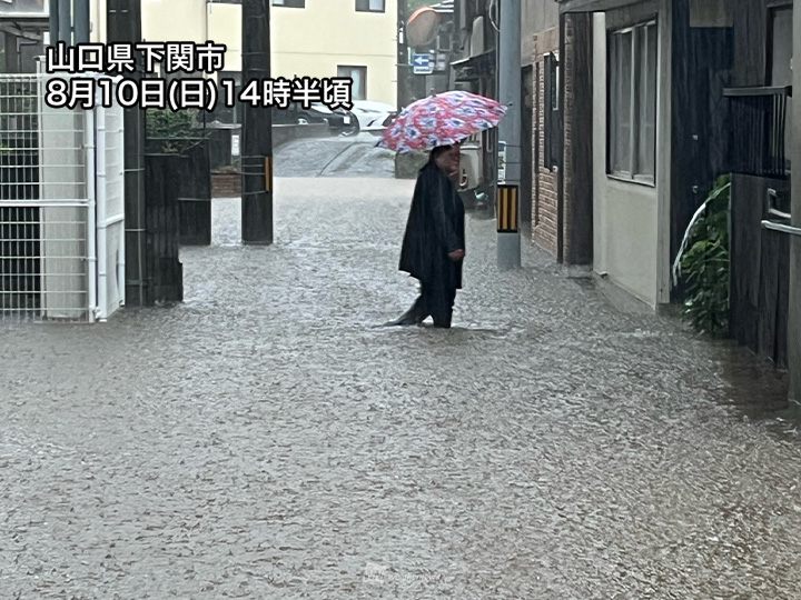 16時00分までの24時間雨量は福岡県宗像市で339.5mm、山口県下関市で300.0mmと観測史上1位の記録を更新しています。下関市では膝ほどまで浸水している様子がウェザーニュースアプリ利用者から報告されました。
