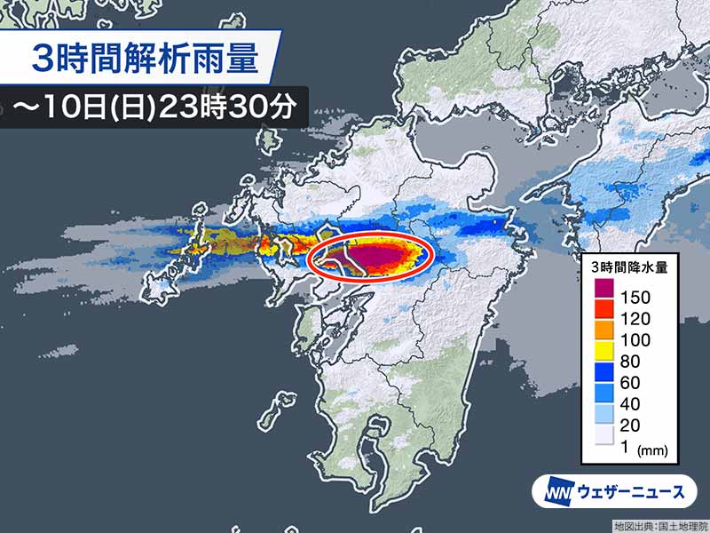熊本県熊本地方に線状降水帯が形成されていて、非常に激しい雨が降っています。南下してきた活発な雨雲は21時台からほとんど停滞し、同じ所で非常に激しい雨が降り続いています。熊本県玉名市付近では、3時間降水量が280mm程度と解析されていて、大雨災害のリスクがかなり高くなっています。