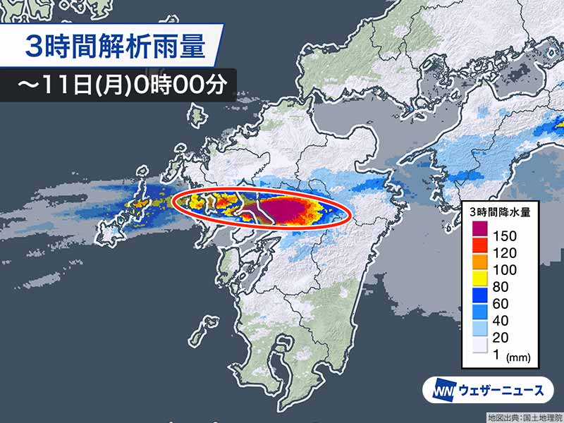 熊本県玉名市付近では、3時間降水量が最大で300mm近くに達したと解析されていて、大雨災害のリスクがかなり高くなっています。