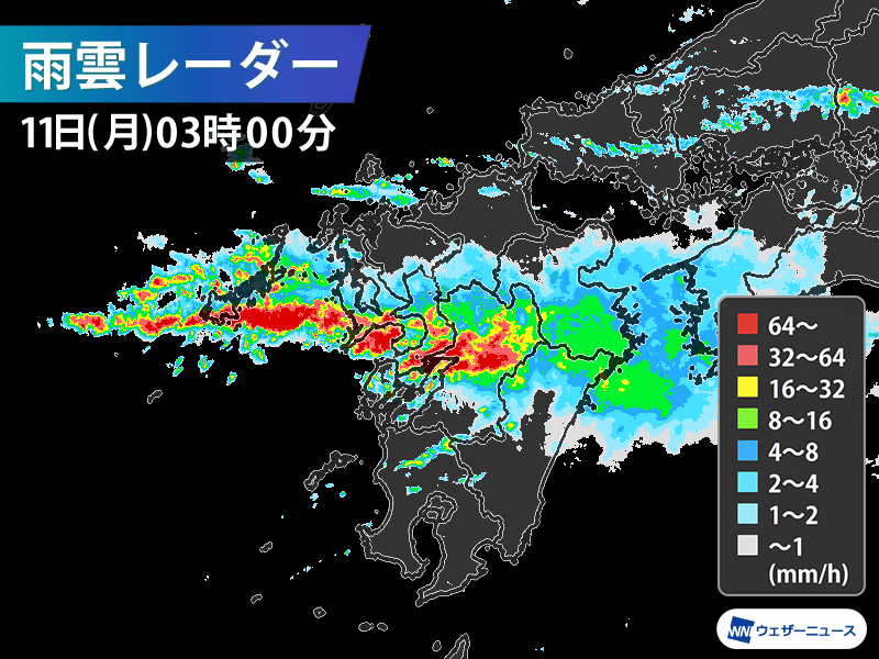 活発な雨雲の帯が熊本県内に停滞していて、3時間降水量が250mm以上と解析されているところもあり、非常に危険な状況になっています。緑川水系の周辺では、大雨により氾濫の危険性だけでなく、土砂災害の発生するリスクも非常に高くなっています。