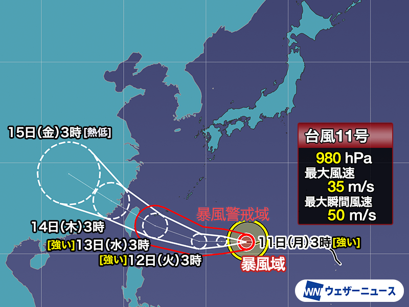 台風11号はこの先も勢力を維持したまま、沖縄の南を西進する予想です。明日12日(火)は沖縄本島の南を進み、明後日13日(水)に先島諸島・八重山地方の付近を通過する可能性が高くなっています。