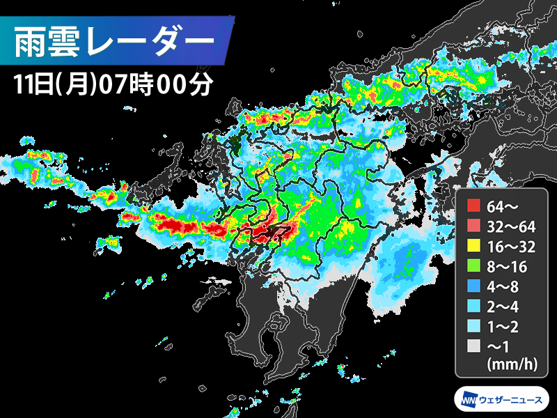 熊本県周辺では、今日11日(月)昼頃にかけて活発な雨雲の通過しやすい状況が続く見通しで、災害発生リスクの高い状況が続く見通しです。身の安全をしっかりと確保してください。