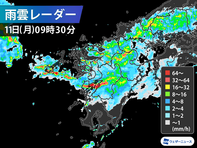 熊本県周辺では、今日11日(月)昼頃にかけて活発な雨雲の通過しやすい状況が続く見通しで、災害発生リスクの高い状況が続く見通しです。身の安全をしっかりと確保してください。