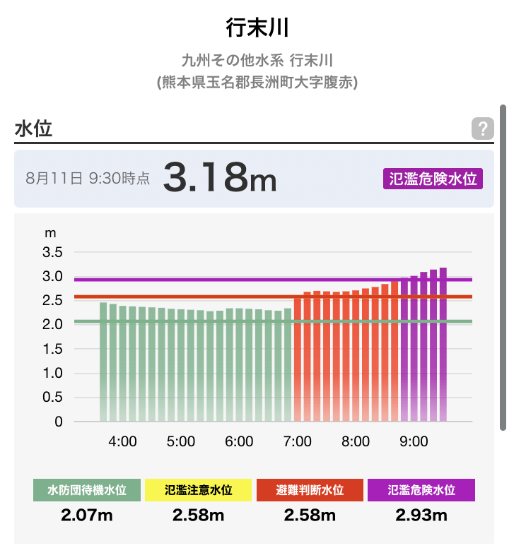 熊本県熊本地方の荒尾玉名地域では昨日夜遅くから線状降水帯が停滞して、明け方にかけて断続的に非常に激しい雨が降りました。その頃と比べれば雨は弱まってきたものの、行末川の水位は現在も上昇中です。このため、氾濫のおそれがあるとして緊急安全確保の避難情報が発令されました。