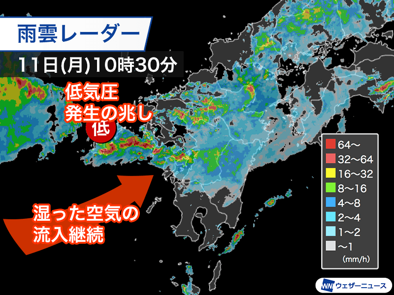 昨夜に比べると水蒸気を供給する風が弱まった分だけ雨の勢いは落ち着きましたが、東シナ海で低気圧が形成されつつあります。低気圧の接近で再び風が強まって雨雲が発達するおそれがあるため、午後も危険な状況は継続する見込みです。
