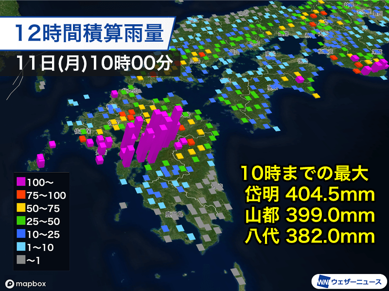 また、12時間の最大雨量は10時00分の時点で玉名市・岱明で404.5mm、山都町で399.0mm、八代市で382.0mmなど多い所で400mm前後に達しました。