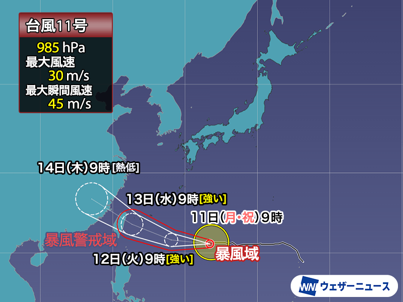 台風11号は、今後は沖縄の南を西進する予想です。明日12日(火)は沖縄本島の南を進み、明後日13日(水)に先島諸島・八重山地方の付近を通過する可能性が高くなっています。