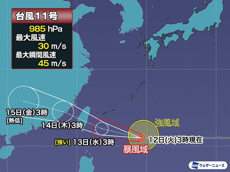 台風11号は今後も西寄りに進み、12日(火)夜遅く〜13日(水)朝にかけて先島諸島の南を通過する予想です。
