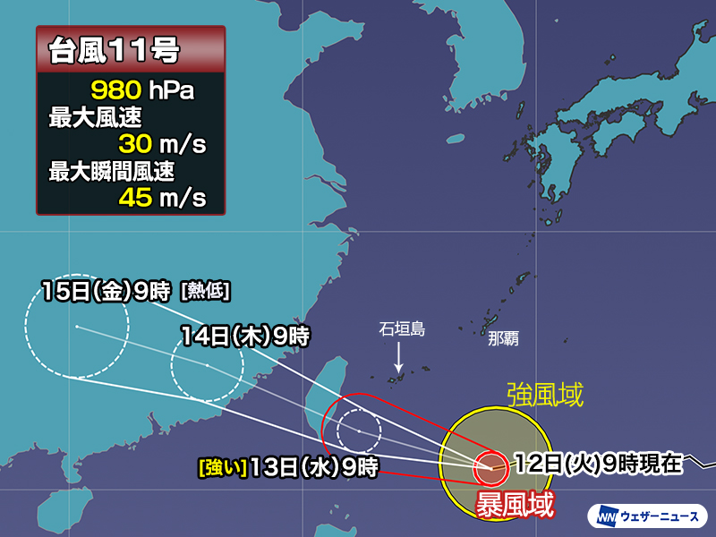 台風11号は今後も西寄りに進み、12日(火)夜遅く〜13日(水)朝にかけて先島諸島の南を通過する予想です。