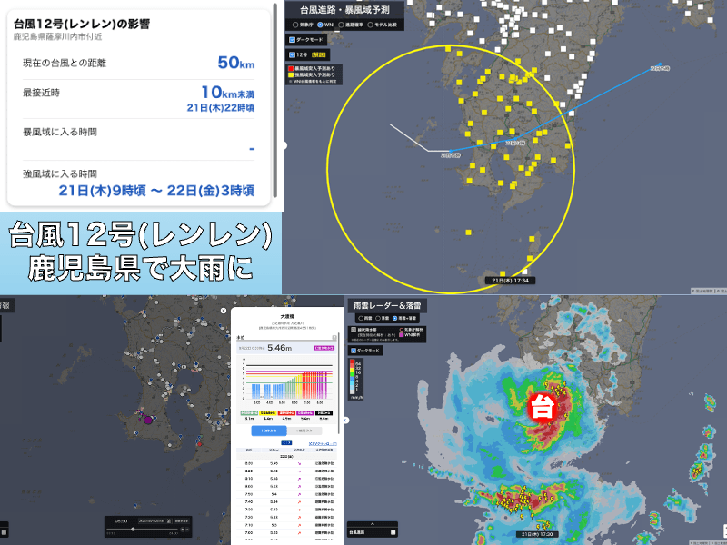 勢力としては強いものではありませんでしたが、暖かく湿った空気が断続的に流れ込んでいた上、台風の動きが遅く、同じような場所に雨雲が停滞し続けたため、鹿児島県では強い雨が続いたところがありました。