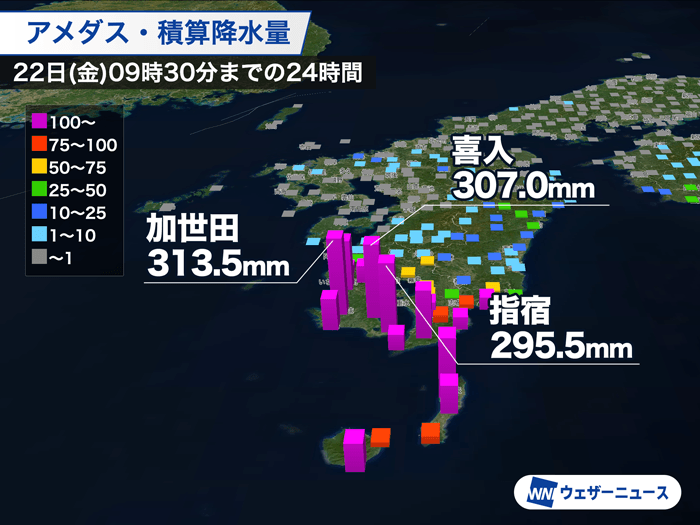 9時30分までの24時間降水量が南さつま市加世田では313.5mm、鹿児島市のアメダス喜入では307.0mmと300mmを超える大雨となりました。