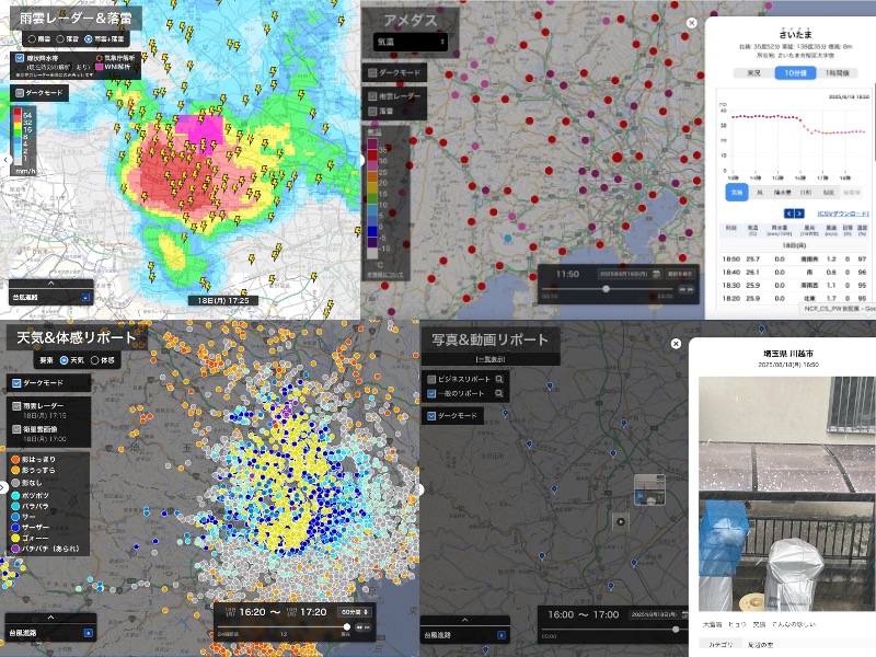 18日(月)は、気温の上昇に加え、風の収束が顕著となった東京都と埼玉県の境付近で雨雲が次々に発生・発達。東京都東久留米市付近では17時00分までの1時間に約100mmの猛烈な雨が降ったとみられ、気象庁は記録的短時間大雨情報を発表しました。