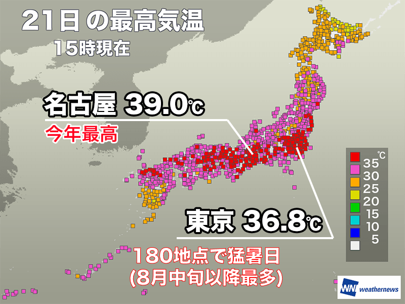 21日(木)は、各地で厳しい暑さとなり、猛暑日地点数は180を記録しました。鳩山と下館で39.3℃、熊谷と名古屋で39.0℃を観測し、名古屋は今年最高記録を更新しました。
