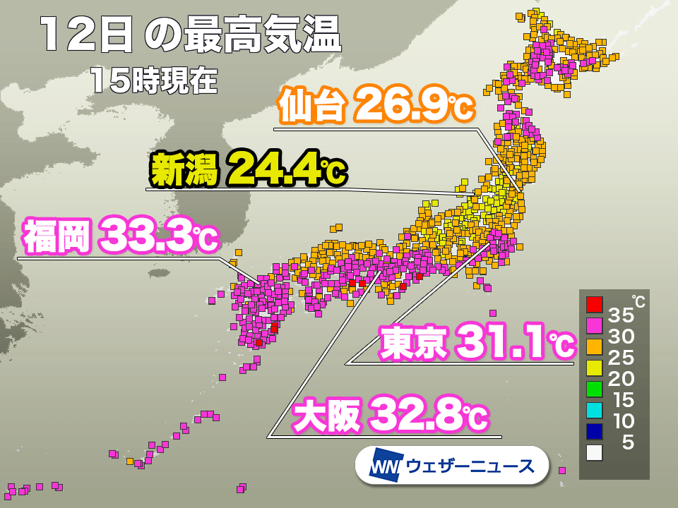 今日12日(火)15時までの最高気温は、東京31.1℃、名古屋33.1℃、大阪32.8℃、広島30.3℃、福岡33.3℃でした。