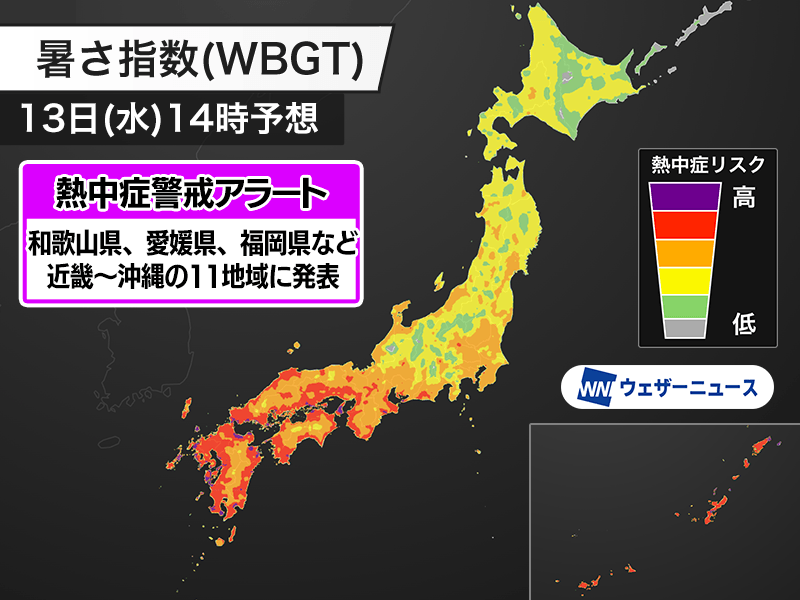 明日8月13日(水)の熱中症警戒アラート 近畿以西の11地域に発表