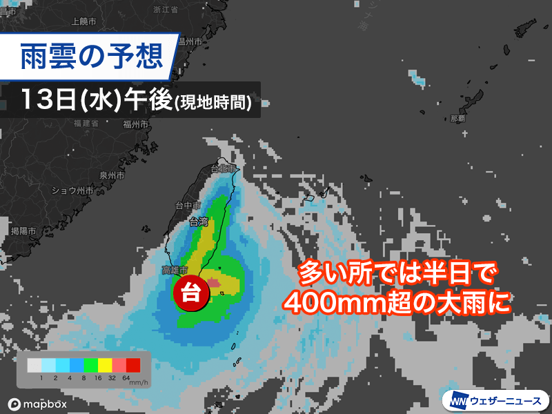 台湾では中心が近づく南部や東寄りの風が吹き付ける東部で風雨が強まる見通しで、山沿いの多い所では今夜までの半日で400mmを超える大雨が予想されます。また、風も強く、30m/s以上の暴風に見舞われる予想です。