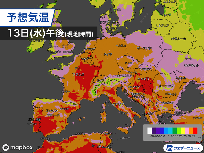 これまではスペインや地中海側が中心だった熱波はヨーロッパの広範囲に広がり、現地時間の12日(火)はパリ・オルリー空港の最高気温が34.5℃まで上昇。ここまで気温が上がるのは7月2日以来です。