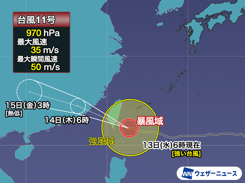 台風11号は先島諸島の南を今後も西寄りに進み、今日の午後には台湾へ接近・上陸する予想です。