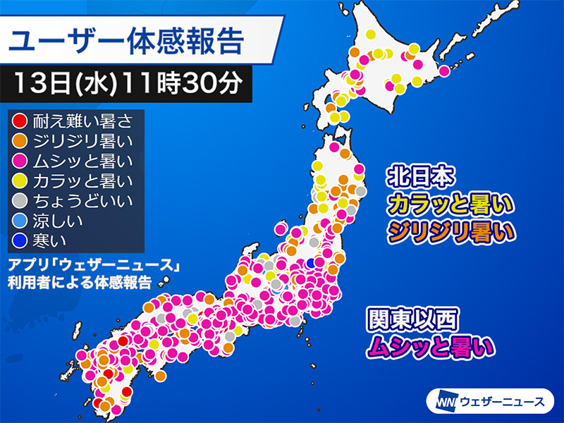 また、前線の南側には高気圧の縁をまわる湿った空気が流れ込んでいます。このため、関東から西日本は湿度が高く、ウェザーニュースアプリの利用者からいただいた体感報告は「ムシッと暑い」が多くなっています。