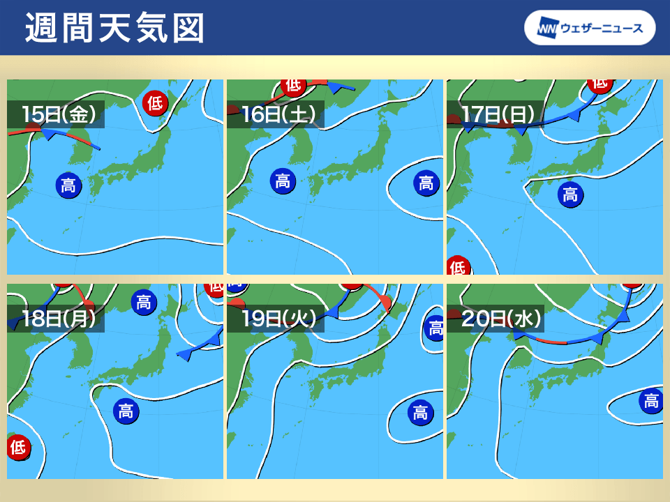 晴れる日が続く西日本や東日本でも天気急変に注意が必要です。大気の状態が不安定なため、午後は内陸部や山沿いを中心に急な雷雨が発生しやすい日が続きます。雨雲が平野部に流れ込む可能性もあるため、晴雨兼用の傘がお守りになる日が多くなりそうです。