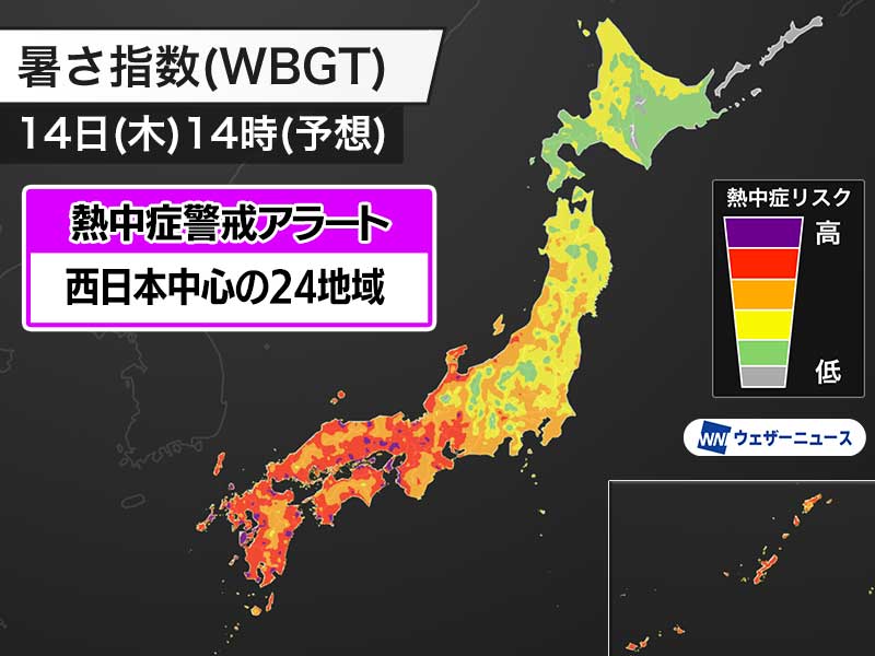 明日8月14日(木)の熱中症警戒アラート 西日本を中心とした24地域に発表