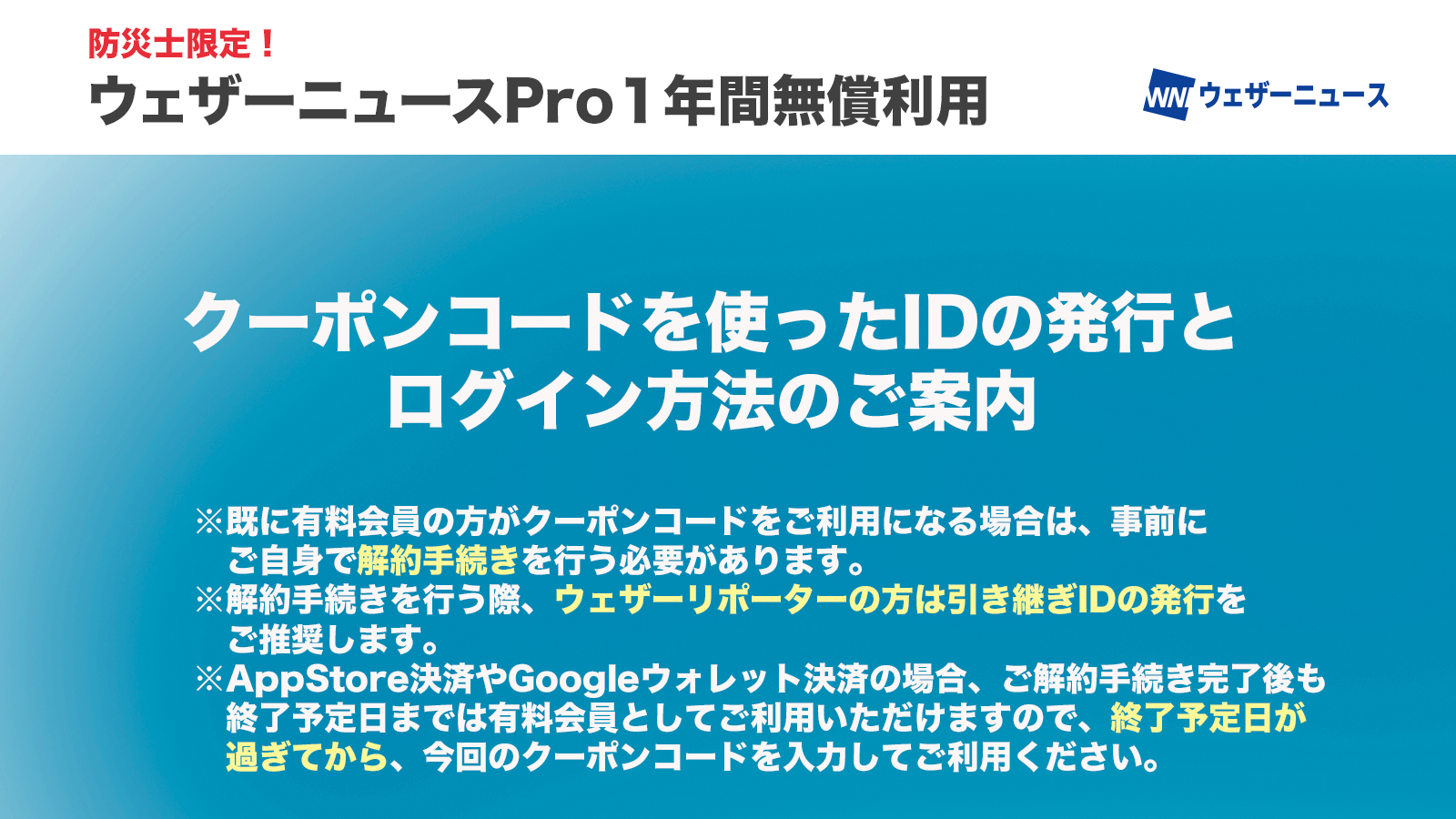 既にウェザーニュースの会員となり、ウェザーリポーターとして投稿を行ったり、ポイントを貯めておられる方は、事前にウェザーリポート情報の引き継ぎIDを発行し、クーポンコードでログイン後、引き継ぎ作業を行ってください。