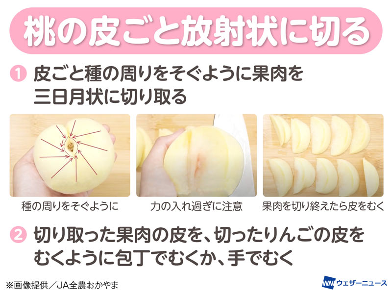 そこで、桃の皮の簡単なむき方の裏ワザを、野菜や果物のプロ、JA尾張中央とJA全農おかやまに伺いました。