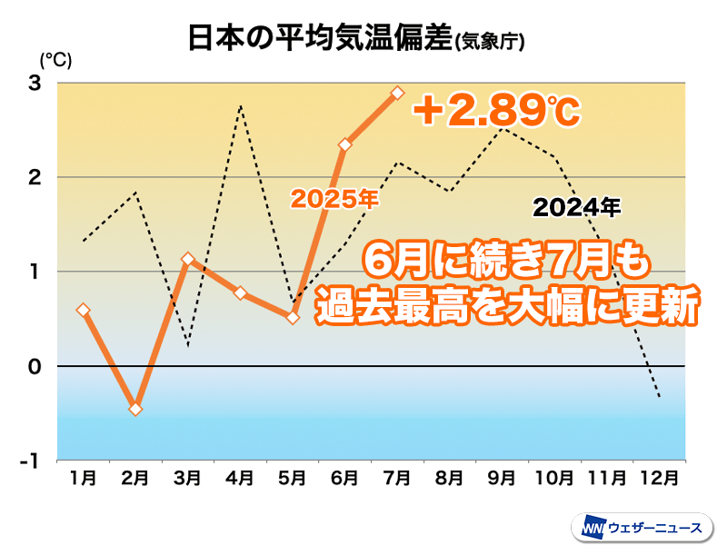 7月の日本の平均気温偏差は+2.89℃でした。これまで最も高かった昨年2024年の+2.16℃を大きく更新し、過去最も暑い7月になりました。6月に続いて2か月連続で、過去最高を更新しています。