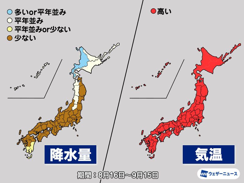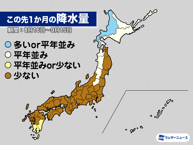 高気圧に覆われて晴れる日が多く、西日本、東日本を中心に降水量は少なくなります。1か月の降水量は九州北部から関東甲信、東北太平洋側で平年よりも少なく、九州南部で平年並みか少ない予想です。