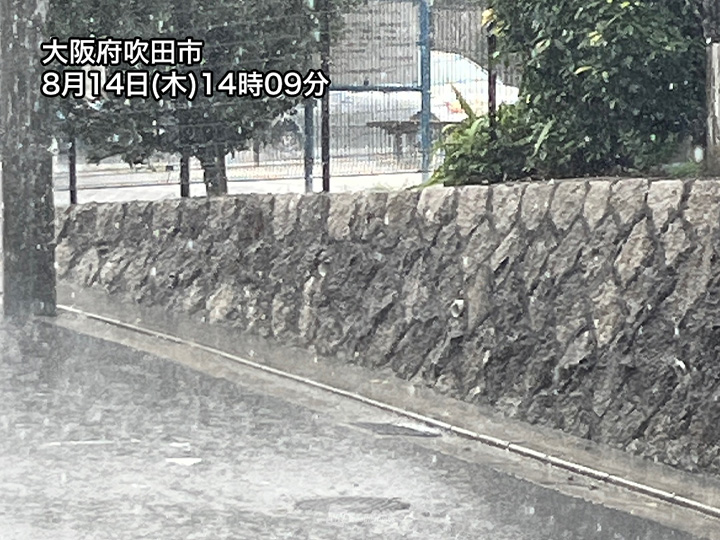 大阪府北部や京都府南部などで雨雲の発達が目立ち、活発な雨雲の下では土砂降りの雨です。大阪市の中心部は晴れている一方で、吹田市では大粒の雨が降るなど、少し場所が違うだけで、天気は大きく変わっています。
