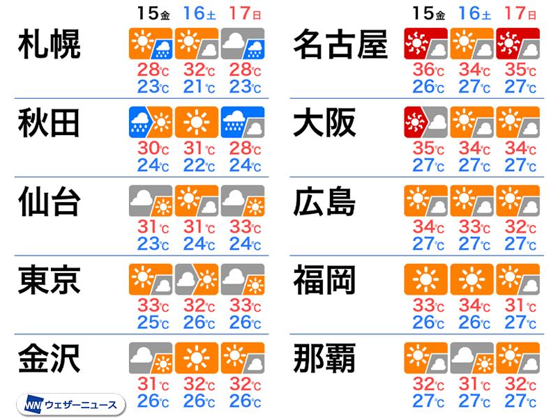勢力を強めた太平洋高気圧が西日本から東日本を覆います。17日(日)にかけては晴れて、強い日差しの照りつける所が多くなりそうです。