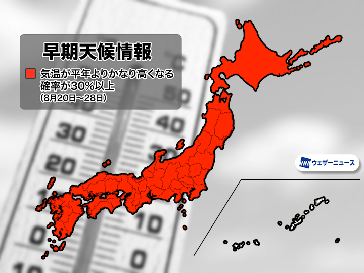 20日(水)からの5日間の平均気温が平年よりもかなり高くなる確率が30%以上と見込まれ、厳しい残暑となる見込みです。