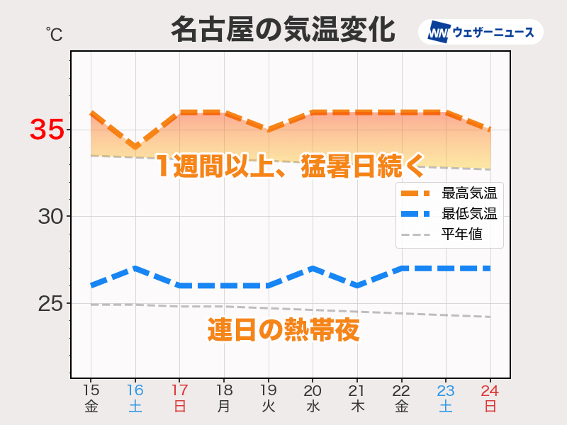 特に東海や近畿で気温が上がる予想となっていて、名古屋市では17日(日)から少なくとも1週間ほどは猛暑日が続くとみられます。気温の上がりやすい内陸部では体温並みの暑さになる日もある見込みです。