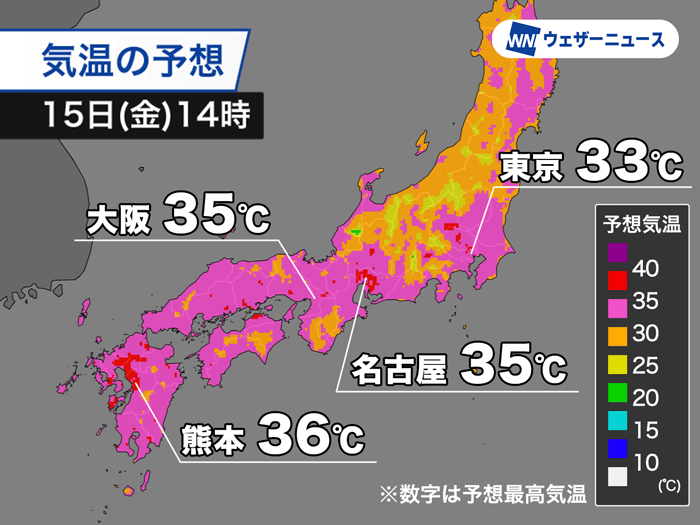 西日本は太平洋高気圧に覆われ、強い日差しが照りつけます。昼間は気温が上昇し、35℃以上の猛暑日のところがある見込みです。厳しい暑さが続くため、熱中症対策をしっかりと行ってください。