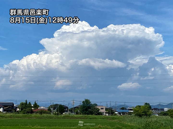 今日15日(金)の関東は朝から強い日差しが照りつけ、内陸部を中心に35℃を超える暑さになっています。気温の上昇によって大気の状態が不安定になっていて、山沿いでは昼頃から雨雲が発達してきました。